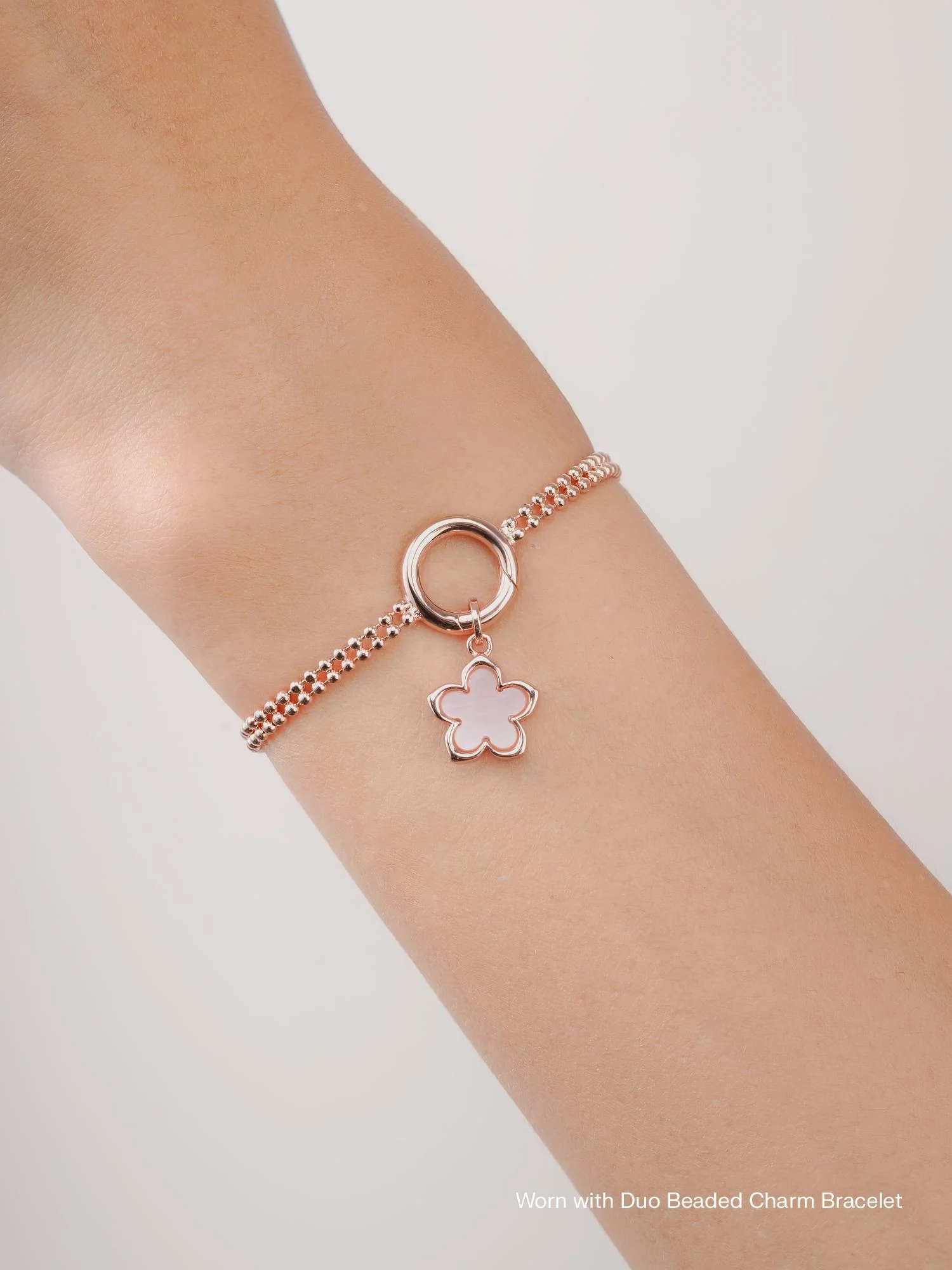 Inspired by the delicate hues of cherry blossoms, this reversible charm showcases a radiant white mother of pearl on one side, and subtle natural pink hue* on the other.