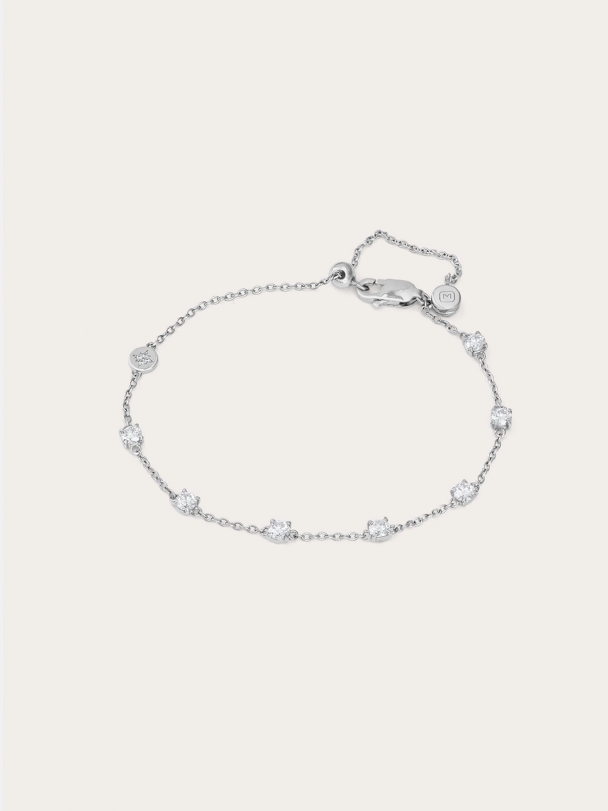 Inspired by the magical memory of your first snowfall, the Snowfall White Moissanite Station Bracelet features 7 brilliant white moissanites that sparkle like glistening snowflakes in the winter sun. Handcrafted in S925 rhodium vermeil.